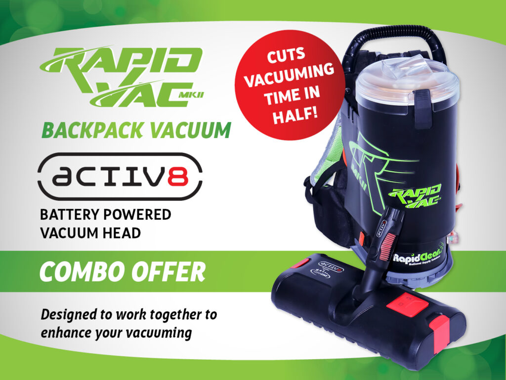 RapidVac MKII + ACTIV8 Power Head = Serious Cleaning Power We’ve paired the powerful RapidVac MKII Backpack Vacuum with the revolutionary Cleanstar ACTIV8 Battery Powered Power Head, a game-changing combo that’s built to boost productivity, reduce operator fatigue, and deliver commercial-grade cleaning performance across carpets and hard floors. Why This Combo Works for You ACTIV8…
